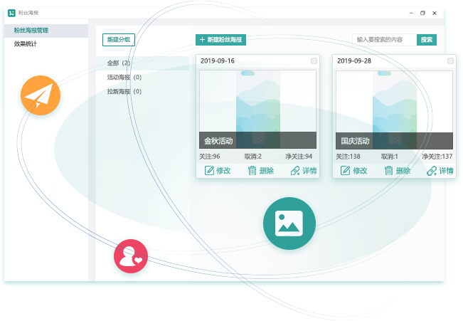 可以新建粉丝海报,可对粉丝海报进行分组归类管理,支持搜索功能,快速查找需要管理的粉丝海报