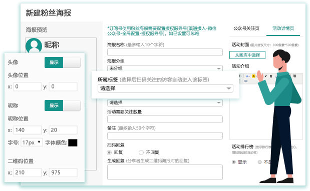 客户新建专属二维码的海报,通过自定义标签、海报规则、通知、回复等,设计出吸引用户的海报,实现粉丝口碑传播。